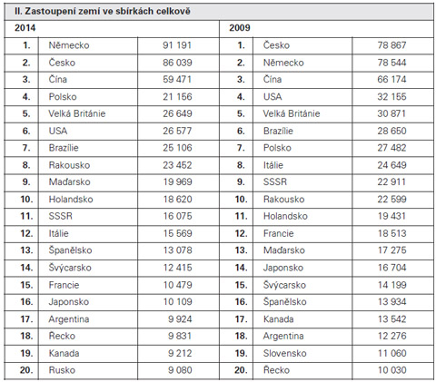 Zde můžeme posoudit dostupnost obalů z jednotlivých zemí v rozdílu uplynulých 5 let. V některých zemích dochází k úbytku obalů. Vysvětlení je velmi jednoduché. V r. 2009 byla ještě započítána sbírka bratří Bromů, která měla 125 104 obalů a pan Szelag měl započítáno 39 082 cigaretových obalů.